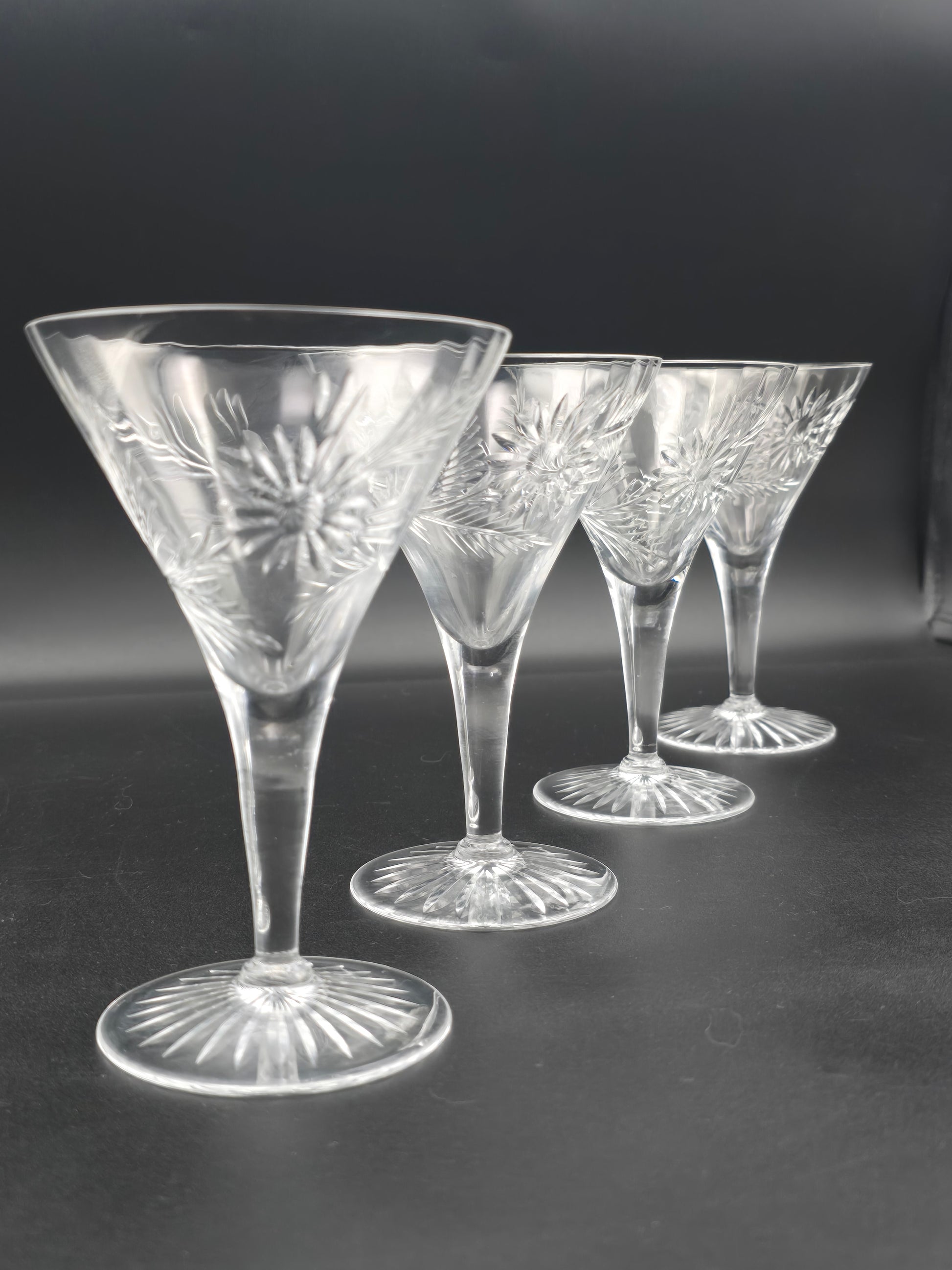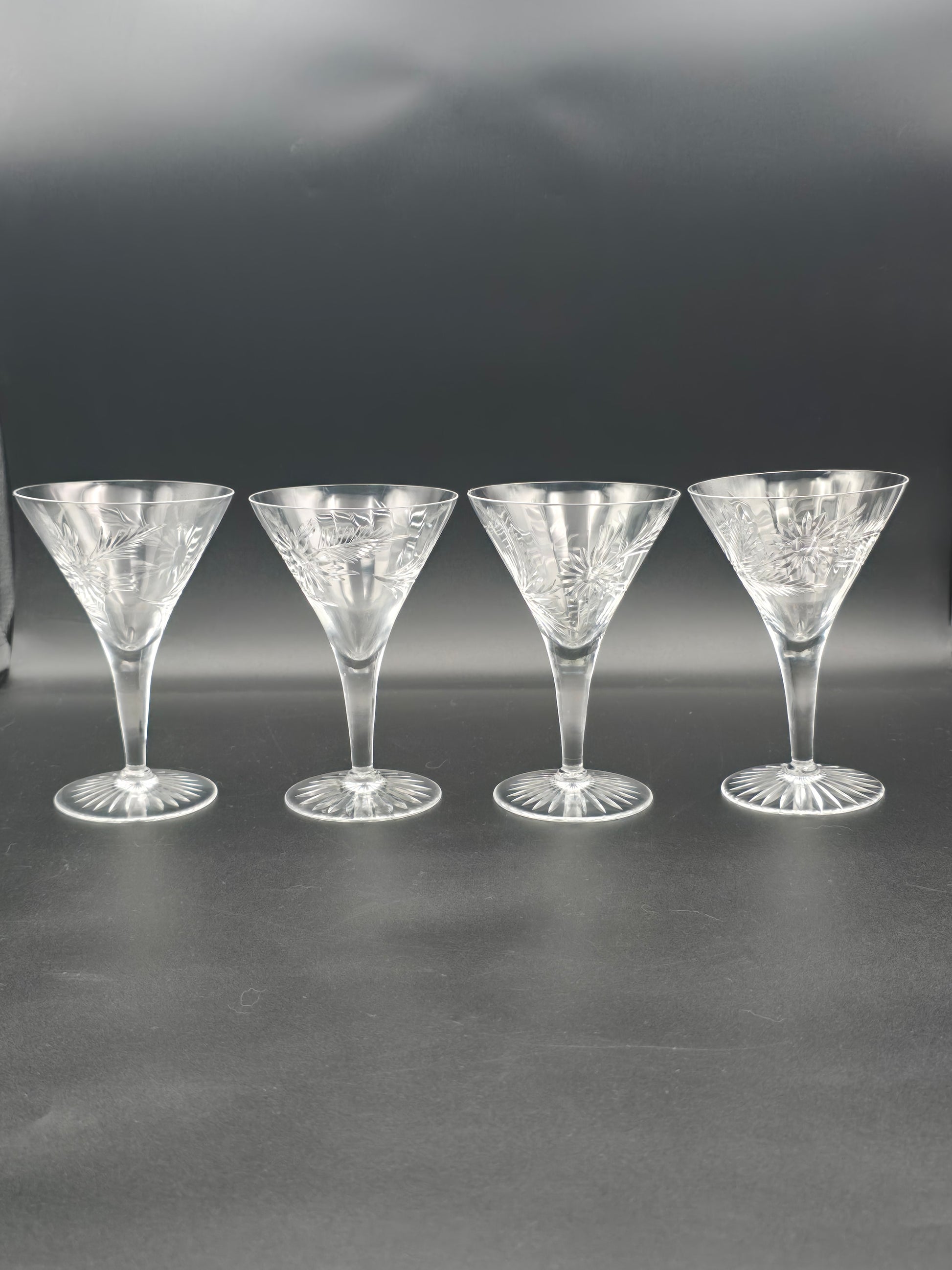 A beautifully cut set of four vintage crystal champagne or cocktail coupes, ideal for refined entertaining or a touch of elegance at any occasion.
