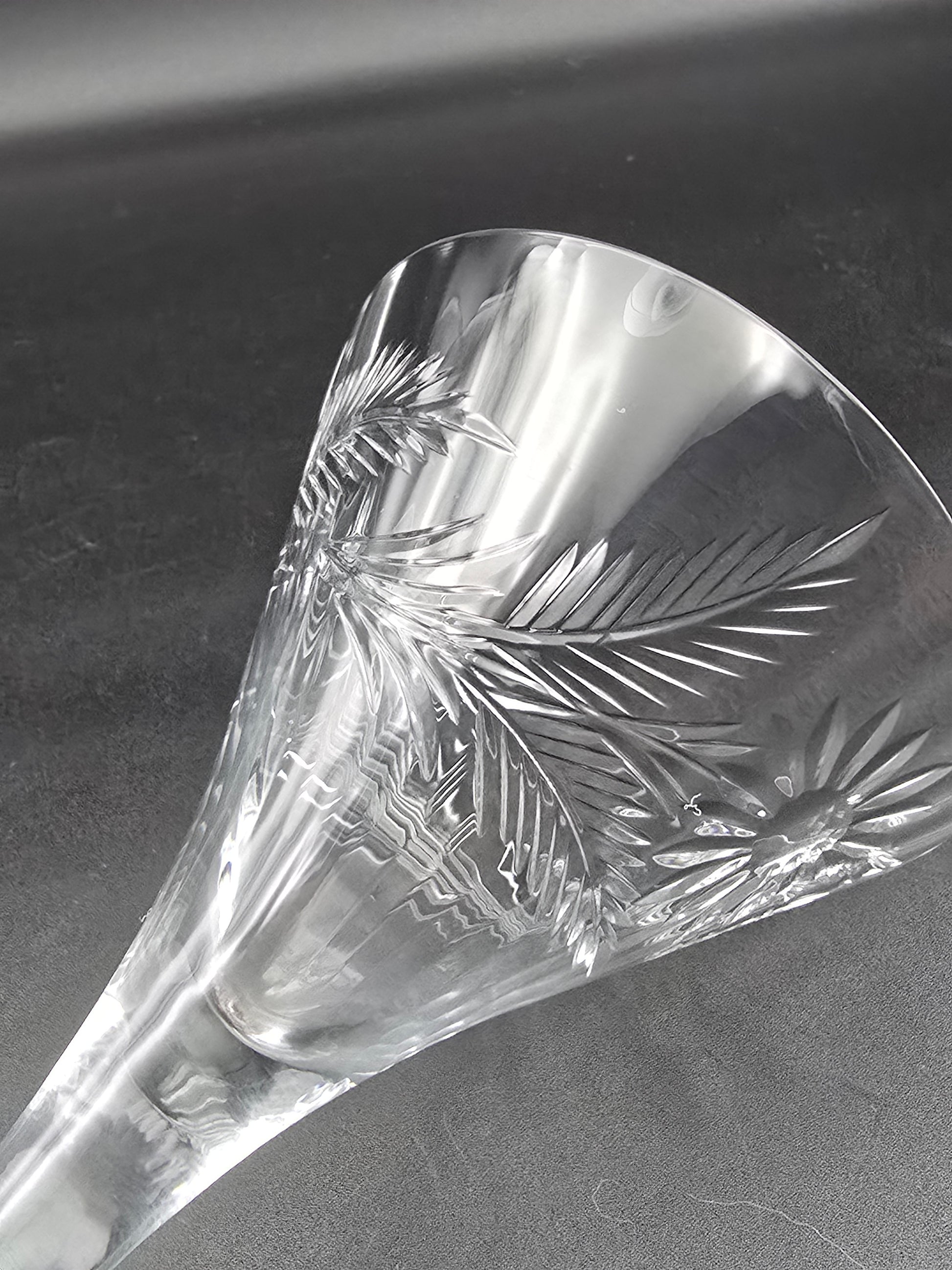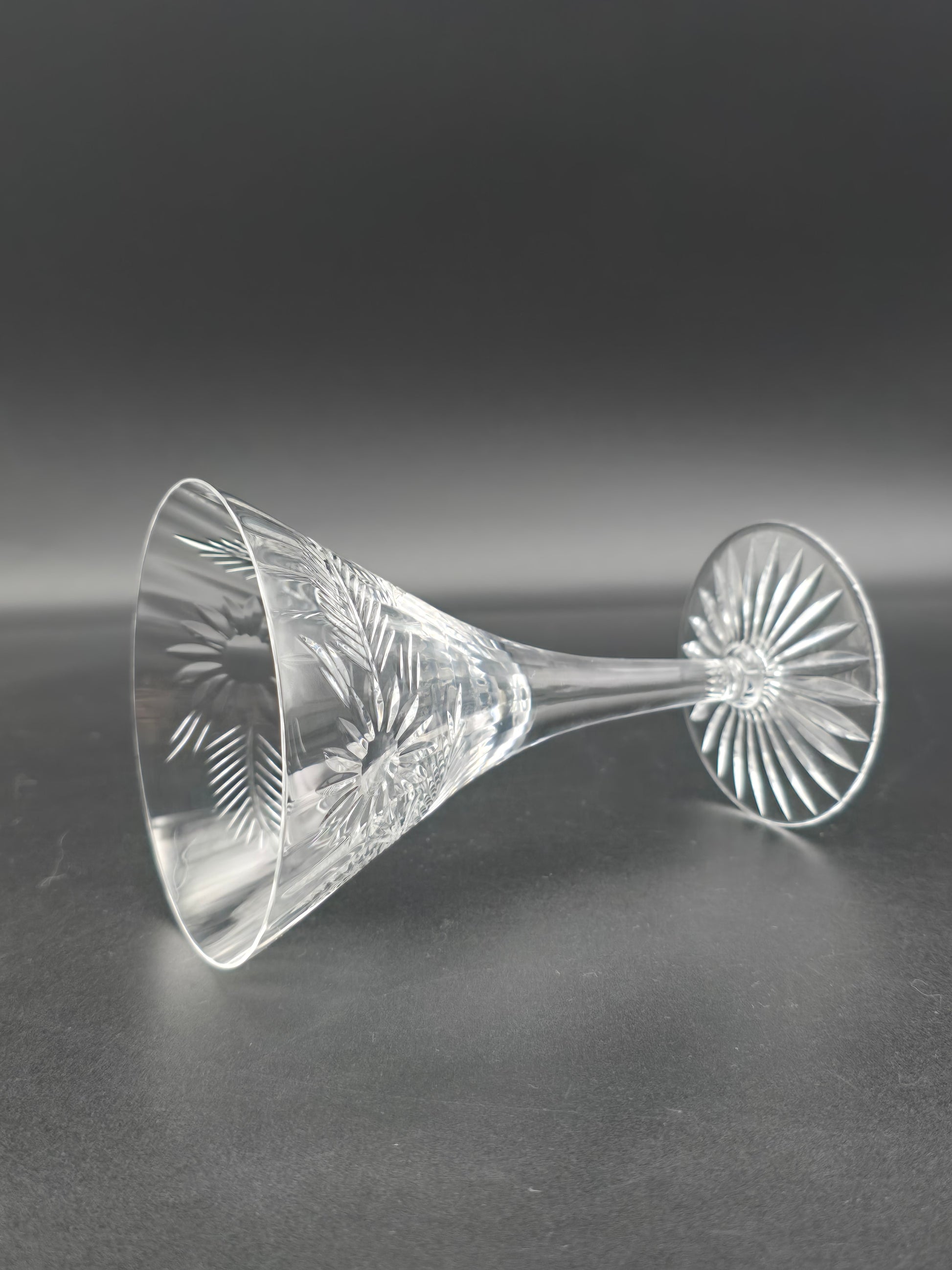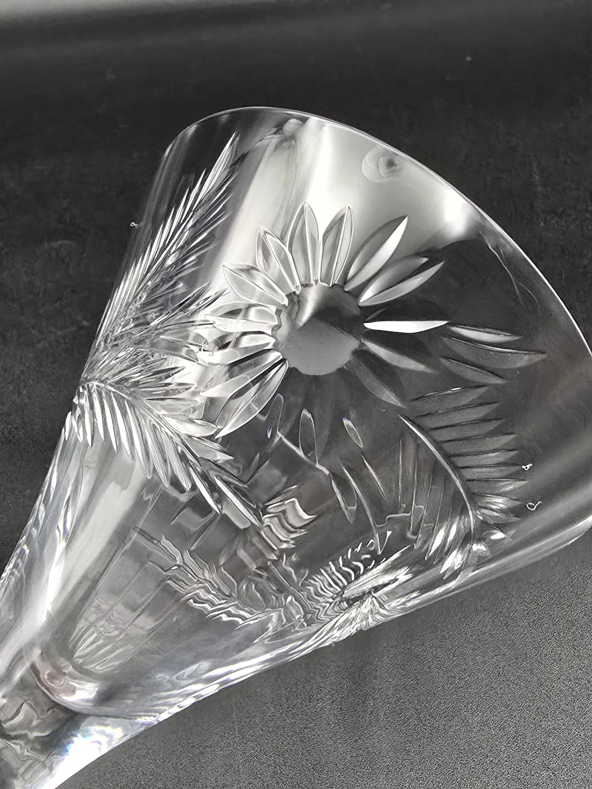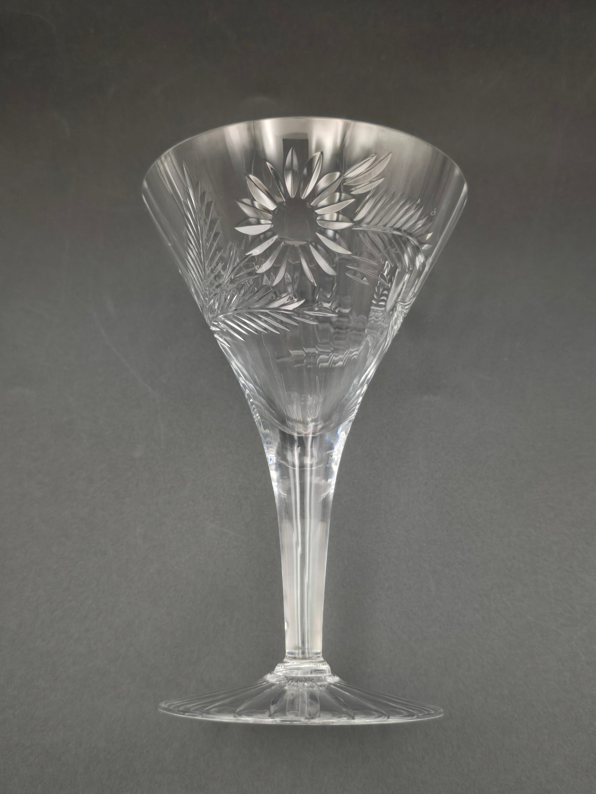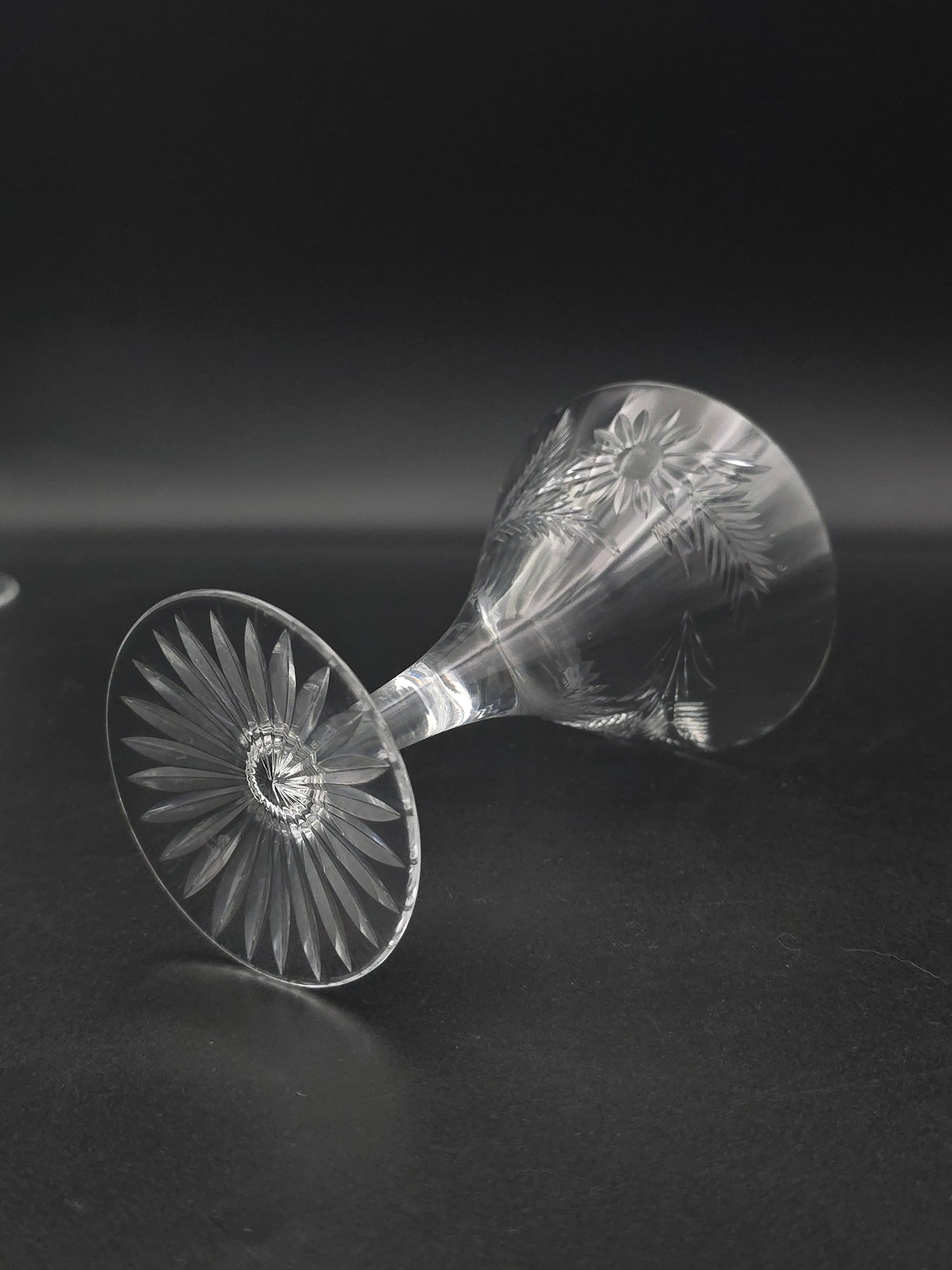 Each glass is finely detailed with a cut fern and sunflower motif, and rests atop a gently tapered stem, finished with a classic starburst cut to the base.