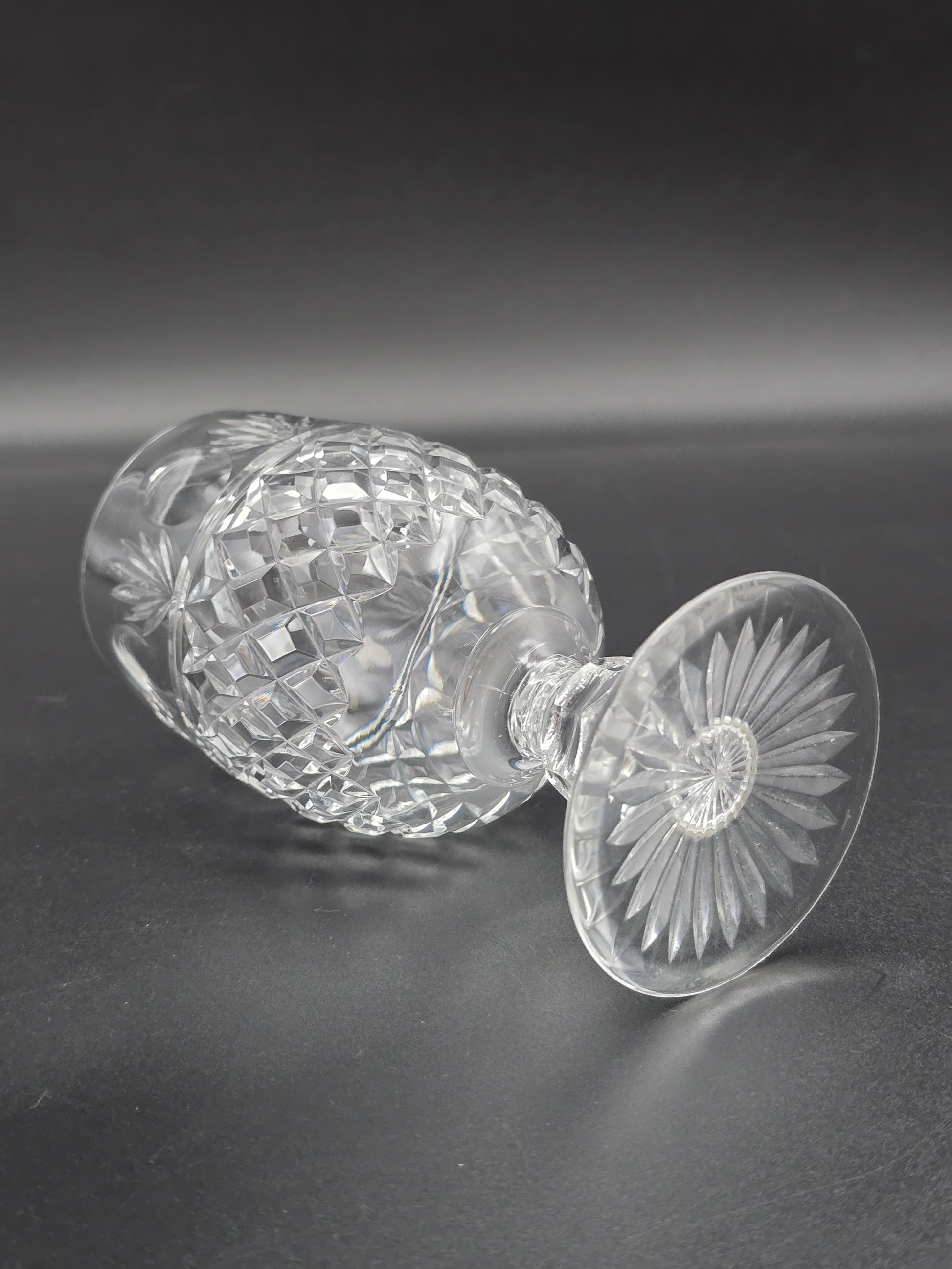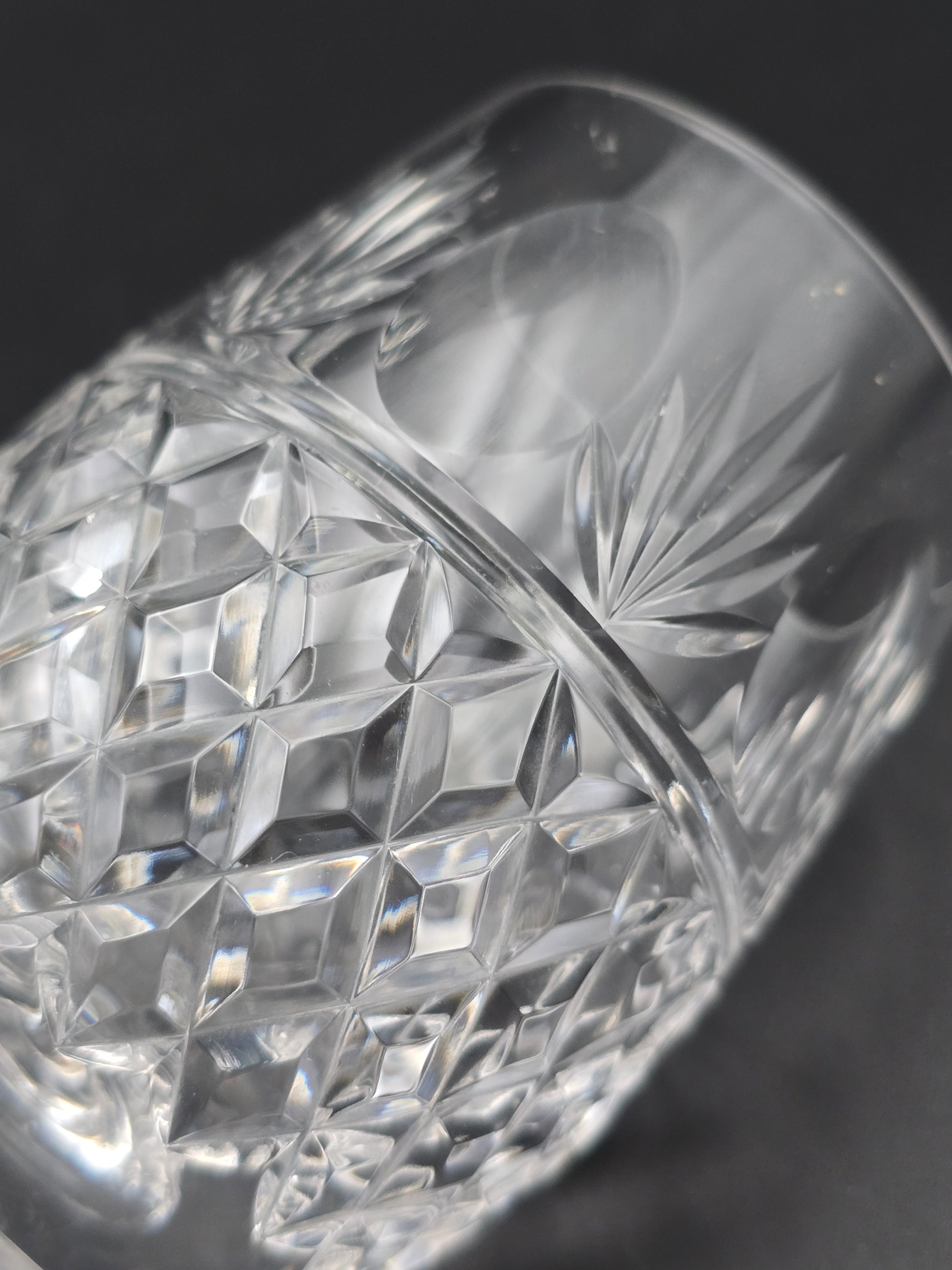 The beautiful cut crystal boasts an elegant pattern of crosses and thumbprint disc cuts, adding a touch of sophistication to your dining experience.