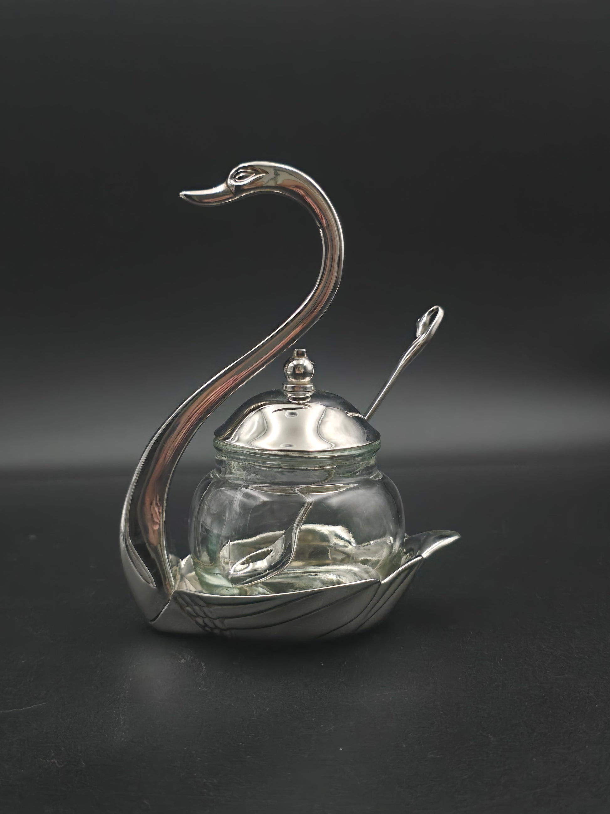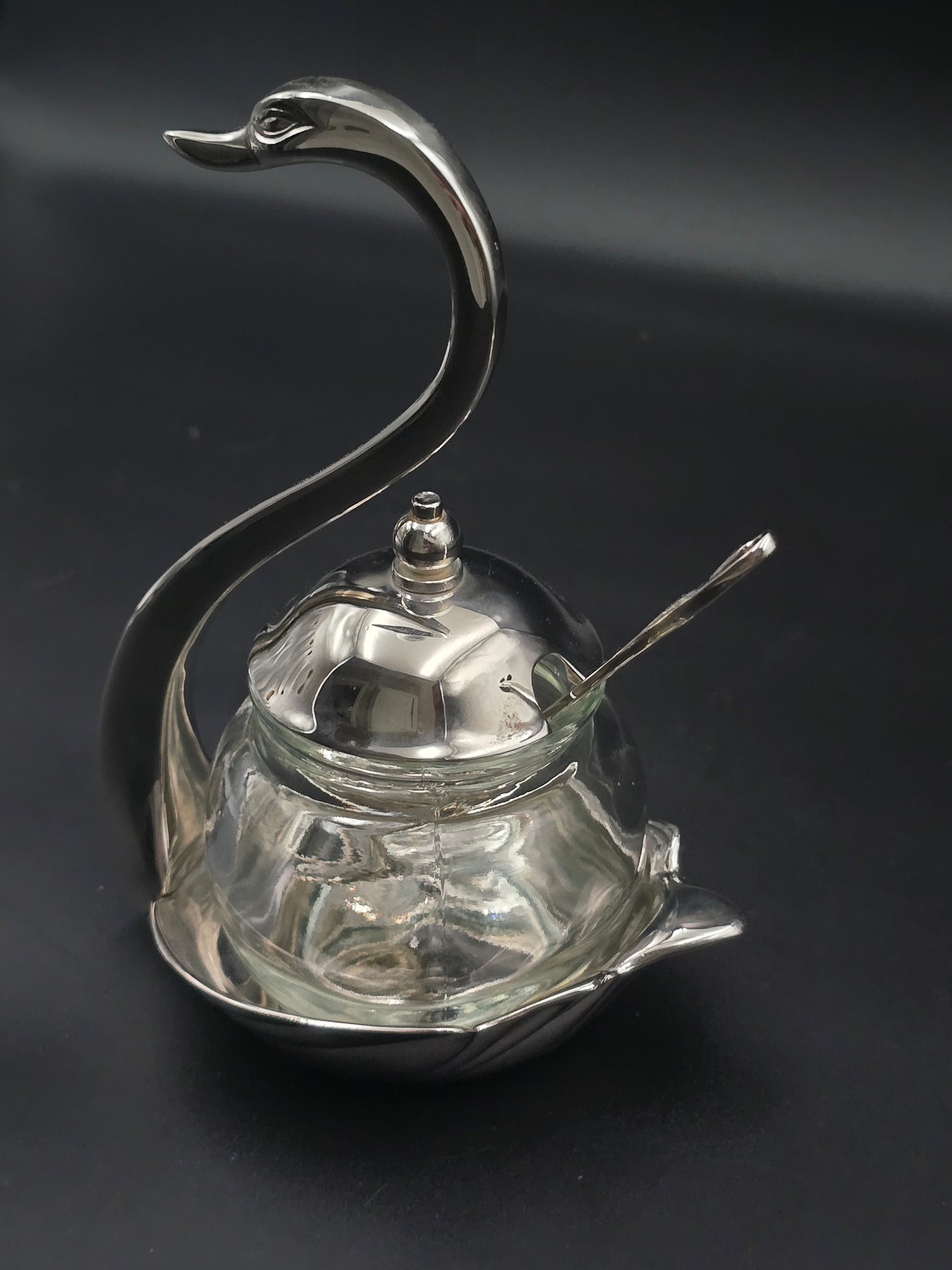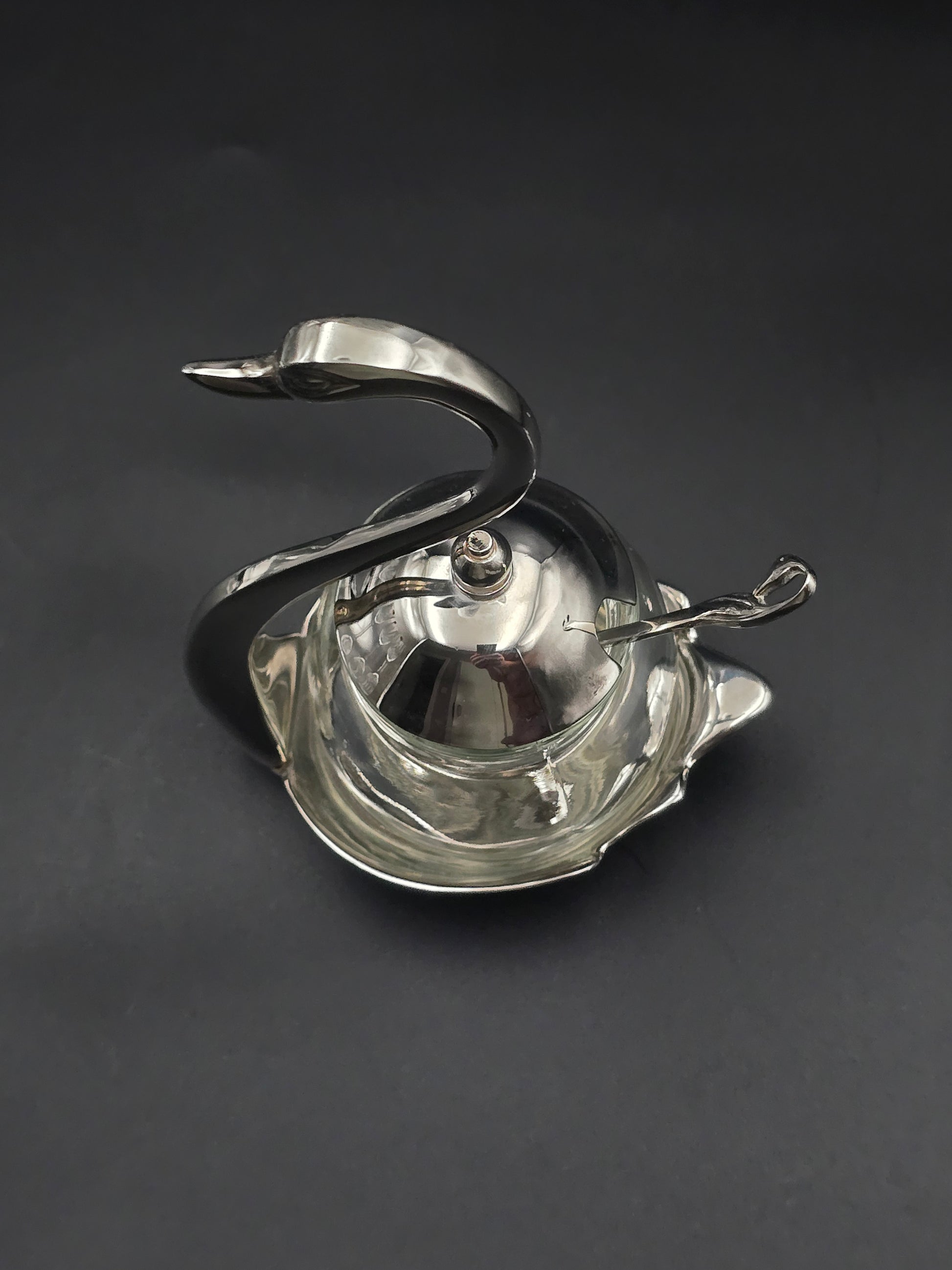 A beautifully elegant vintage swan sugar bowl with its original glass insert and matching spoon, finished in a gleaming chrome-plated frame.