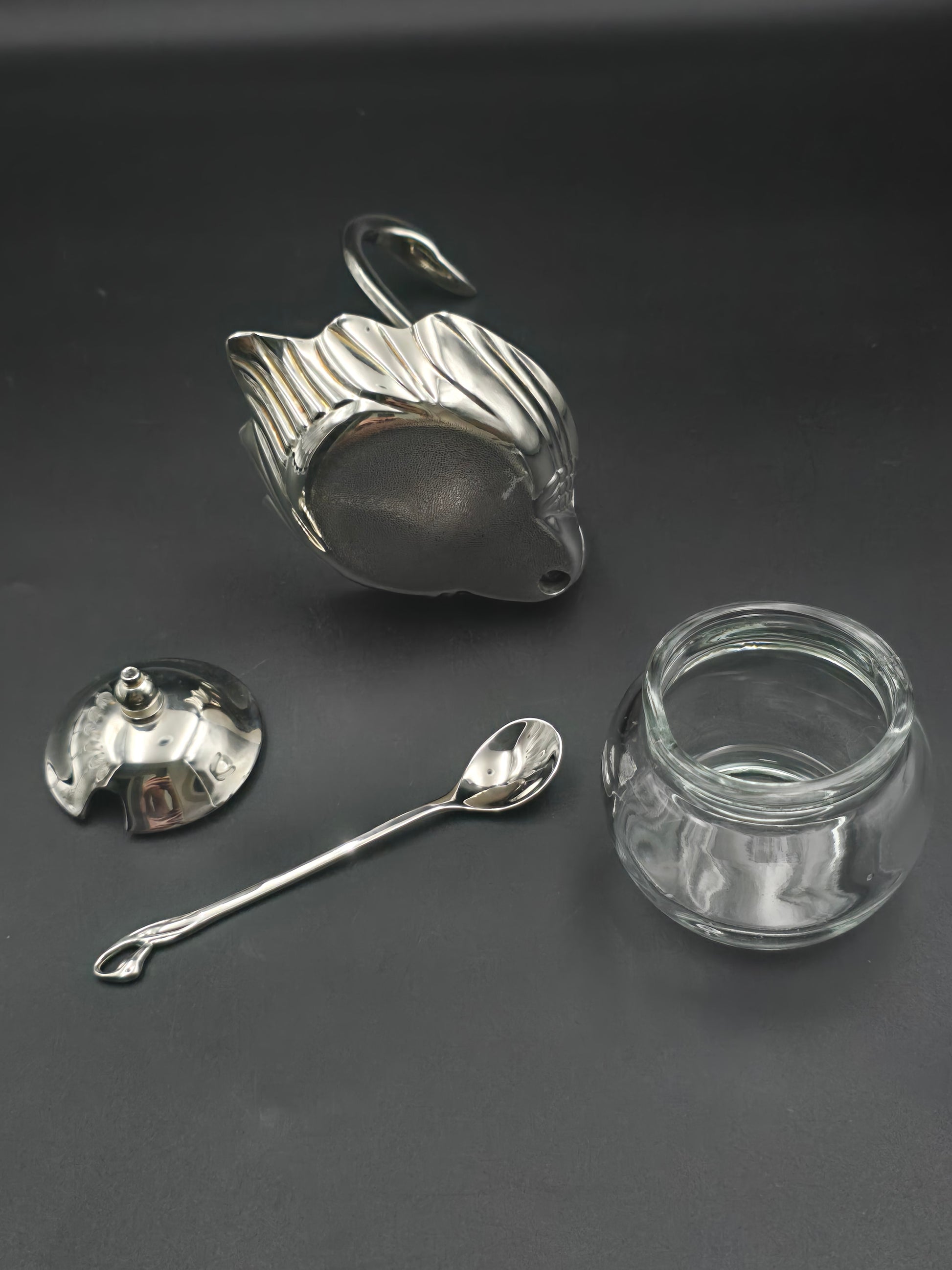 Vintage Chrome Swan Sugar Bowl with Spoon – Glass Insert – Art Deco Style Condiment Dish