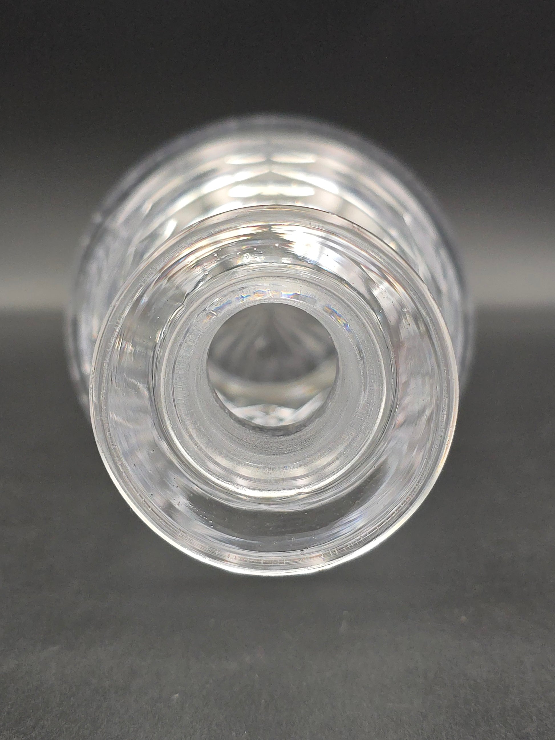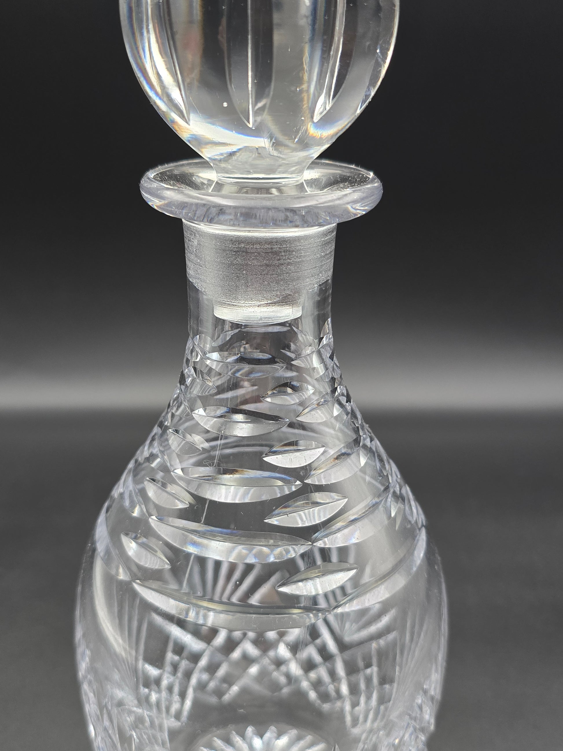 Though unmarked, this piece is clearly high-quality lead crystal, featuring a deeply cut diamond and fan pattern to the body, with delicate oval motif detailing to the neck and a striking globe-cut stopper that catches the light beautifully.