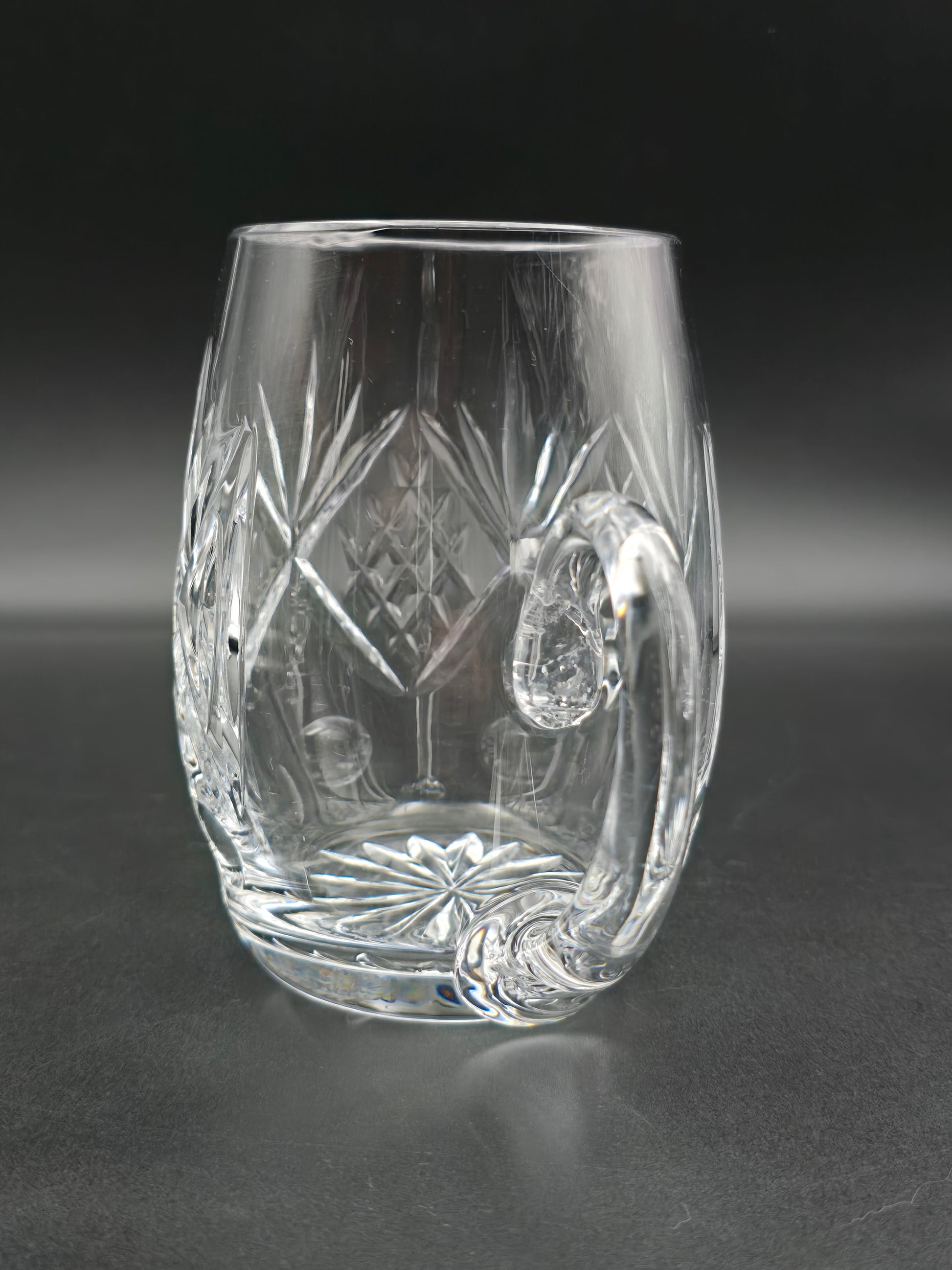A beautifully cut vintage crystal beer tankard with a more oval-shaped body and slightly shorter form, giving it a unique and more rounded profile in the hand.